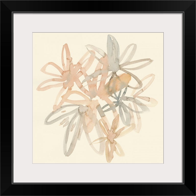 <p>Square watercolor painting of a bouquet of muted flowers of pink and gray on a beige background.</p>