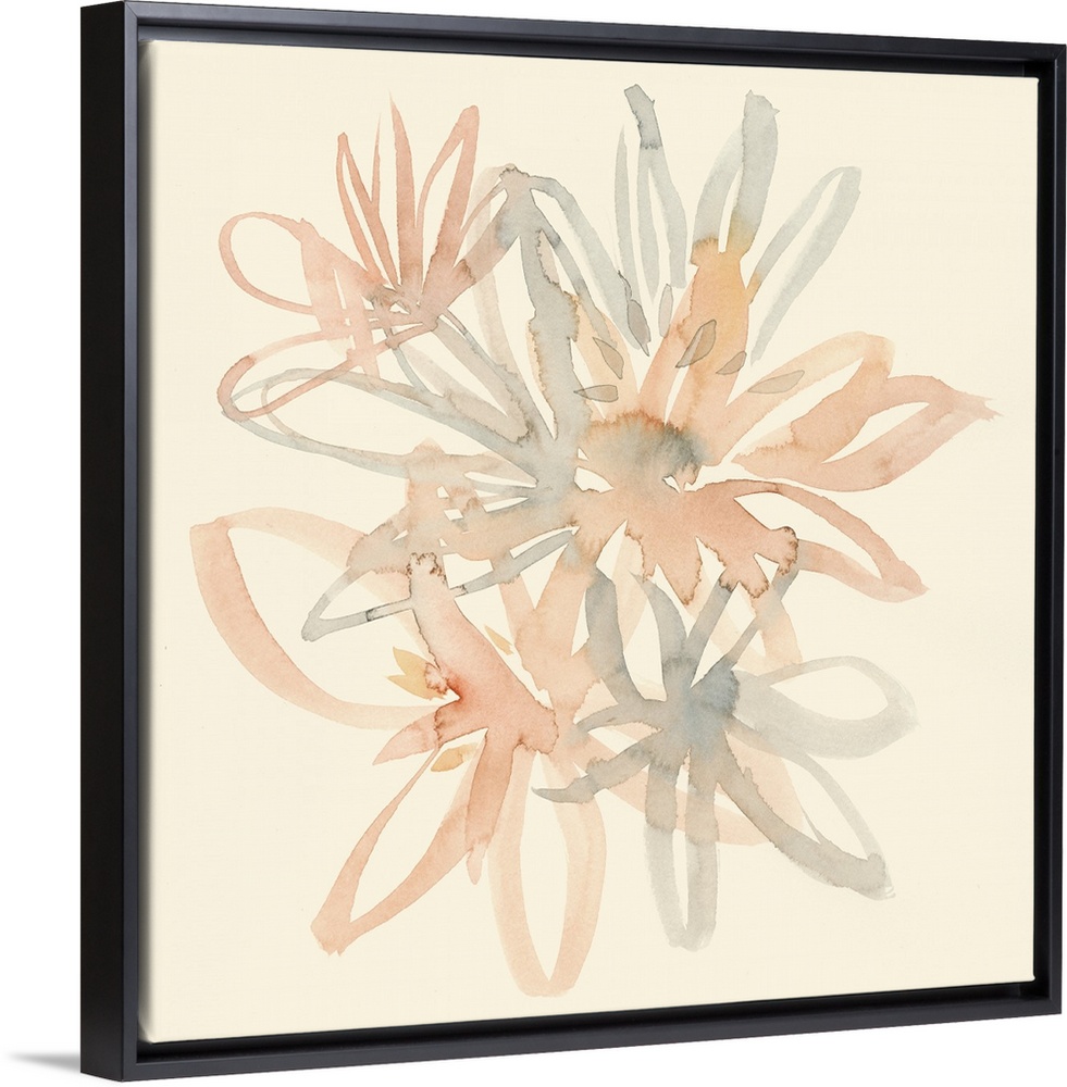 <p>Square watercolor painting of a bouquet of muted flowers of pink and gray on a beige background.</p>