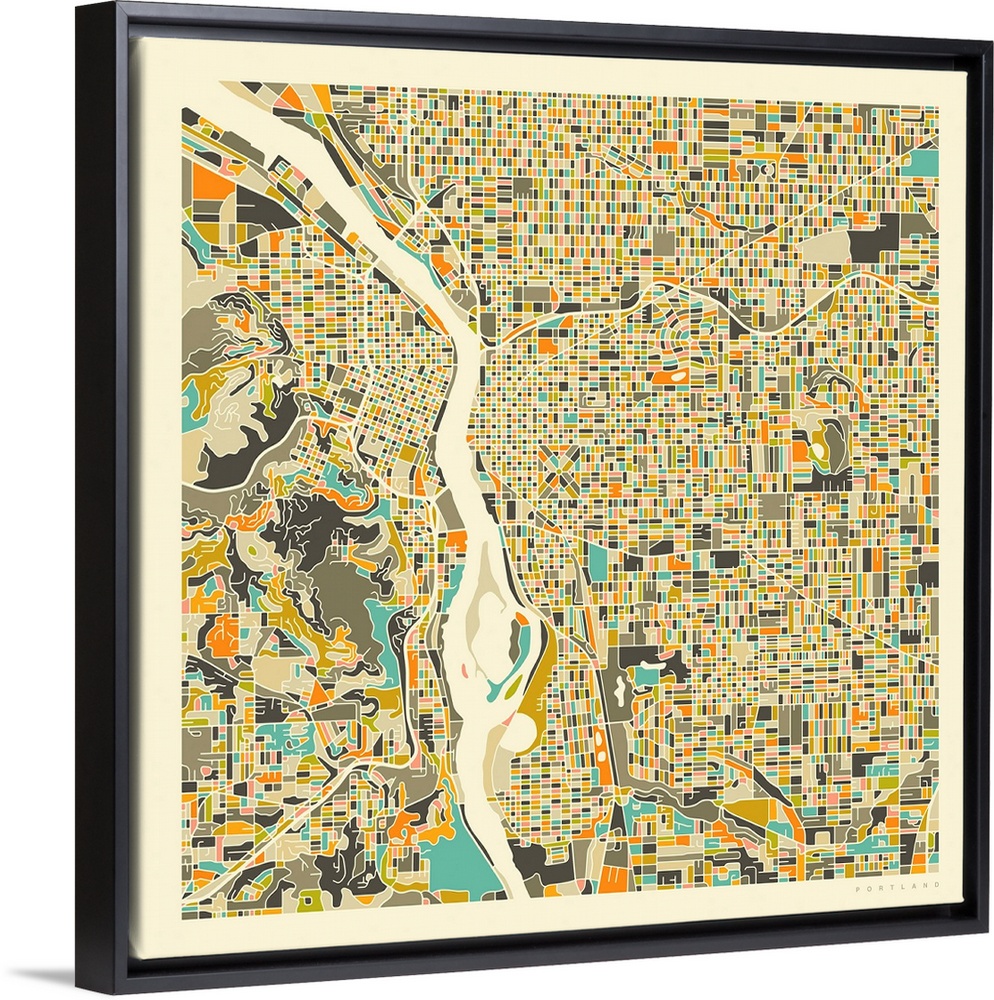 <p>Colorfully illustrated aerial map of Portland, Oregon on a square background.</p>