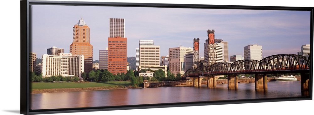 <p>Panoramic photograph of skyline, waterfront, and bridge.</p>