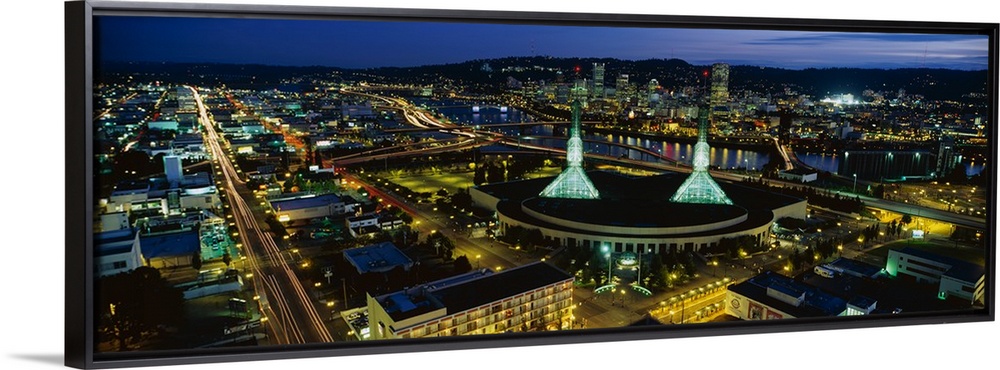 <p>Oregon's most populous city lit up in the evening by the glowing lights of office buildings and traffic.</p>