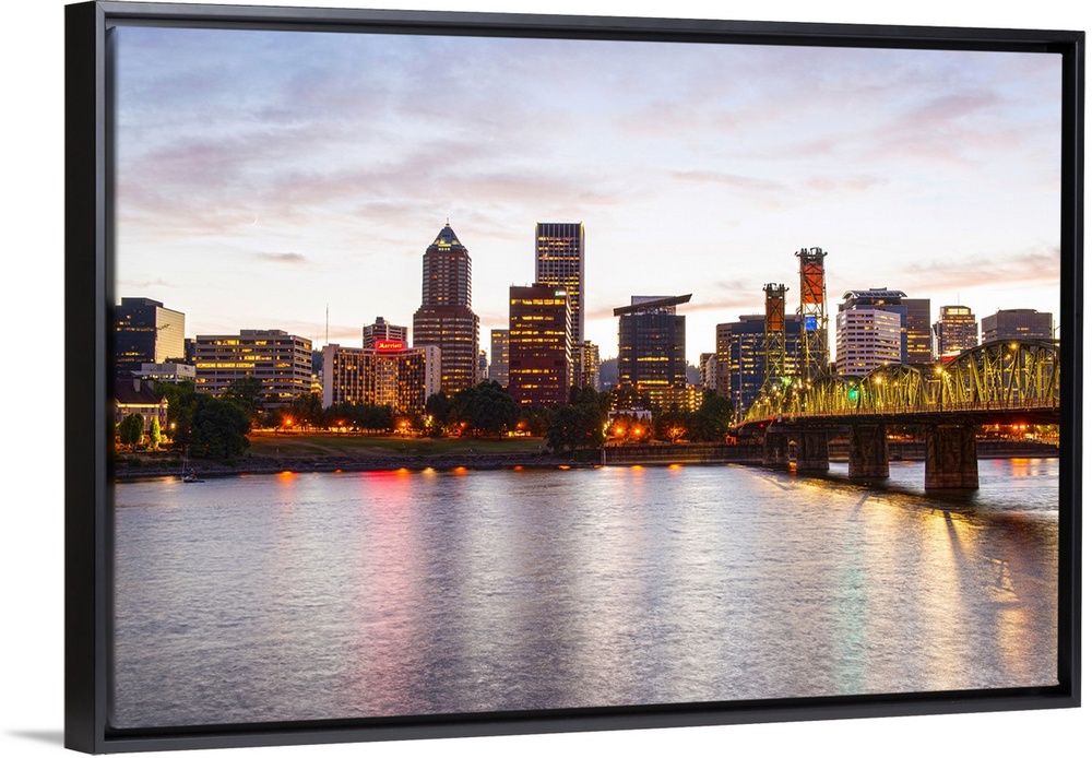 <p>Photograph of the Portland, Oregon skyline lit up at sunset with yellow lights and a small crescent moon above.</p>