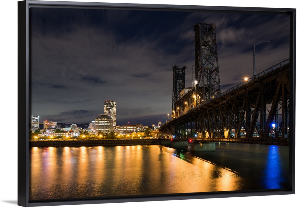 <p>Photograph of Portland lit up at night with the Willamette River in front and the Steel Bridge on the side.</p>