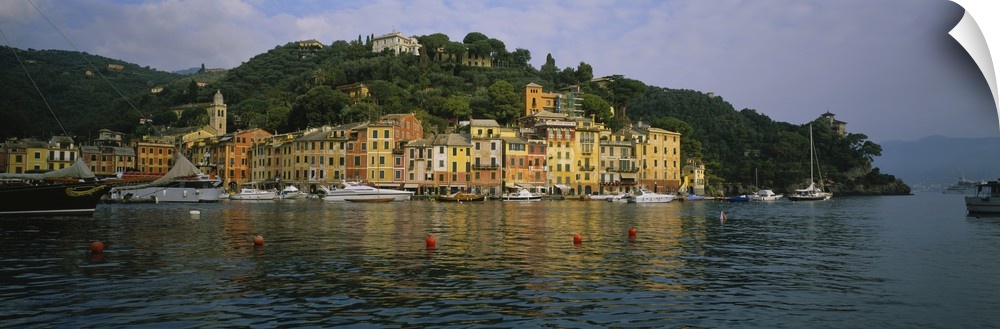 <p>This is a panoramic photograph of the picturesque harbor taken from on the water.</p>