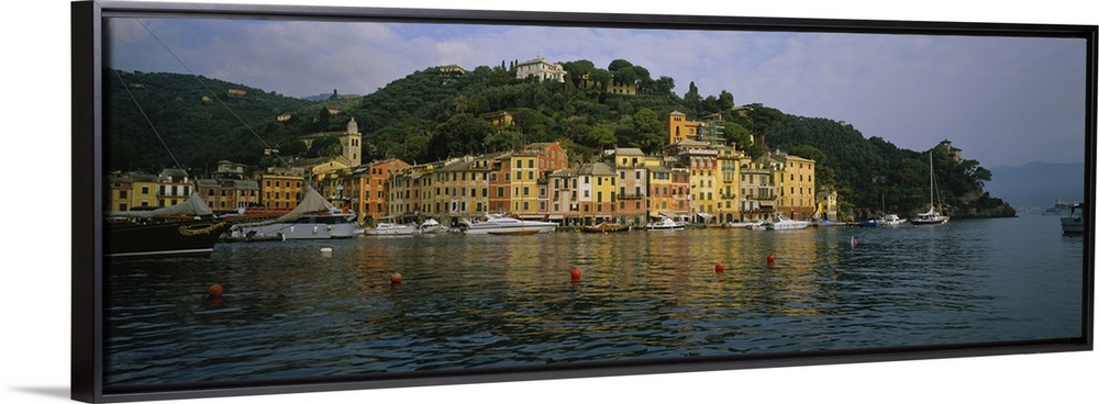 <p>This is a panoramic photograph of the picturesque harbor taken from on the water.</p>