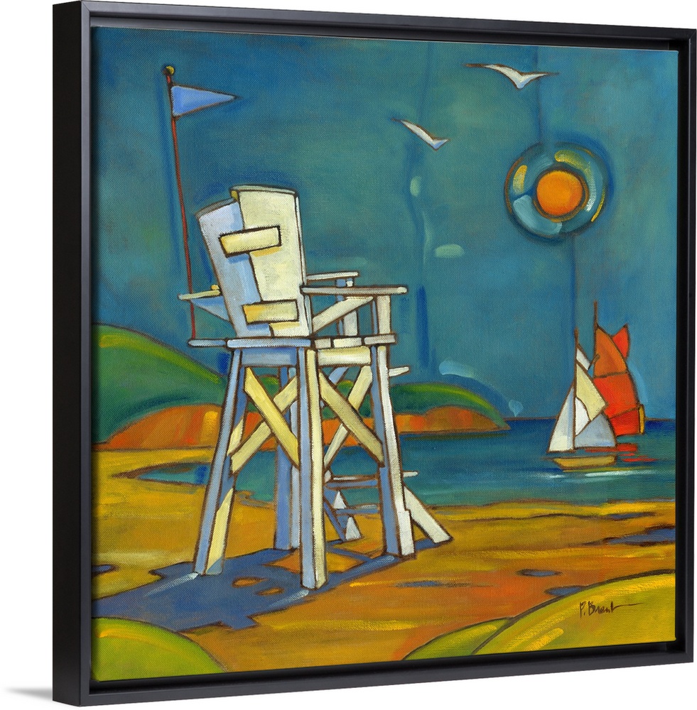 <p>Stylized painting of a beach with sailboats and a lifeguard stand.</p>