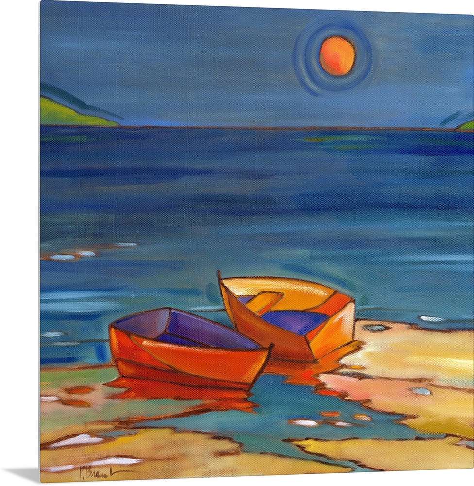 <p>Stylized painting of a beach with two small boats on the shore under the sun.</p>