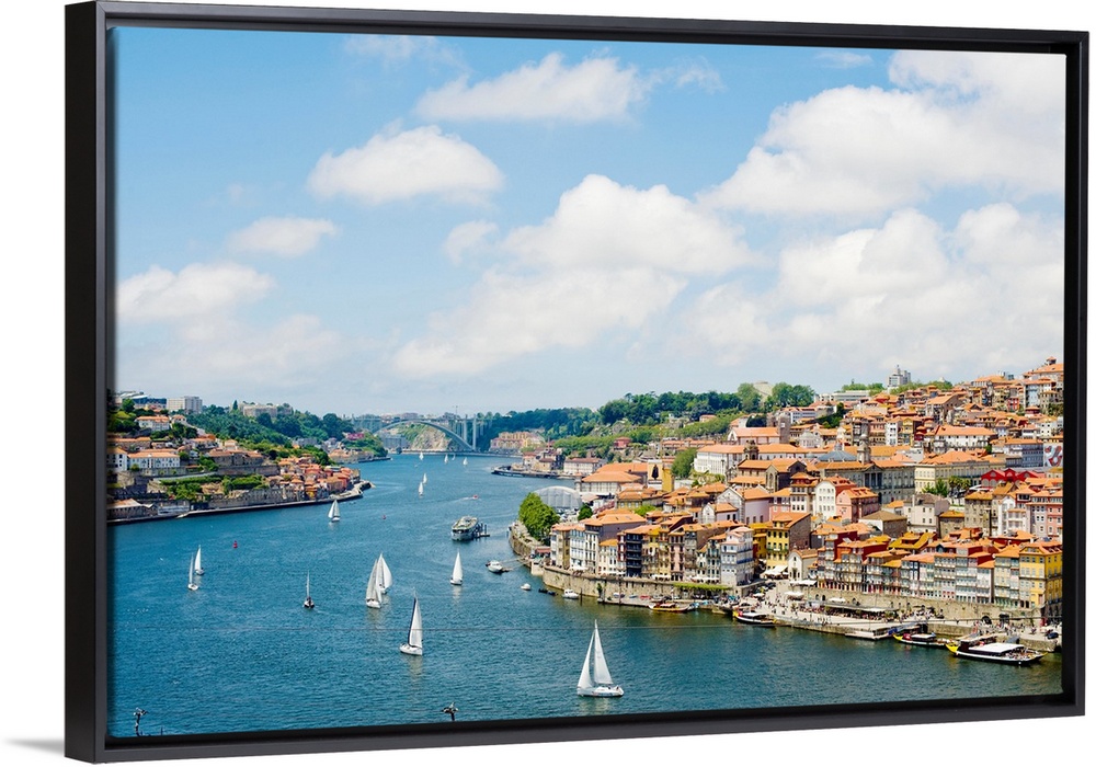 <p>A view of Porto's historic centre and the Duoro River flowing towards its estuary and the Atlantic Ocean, Porto, Norte, Portugal, Europe</p>