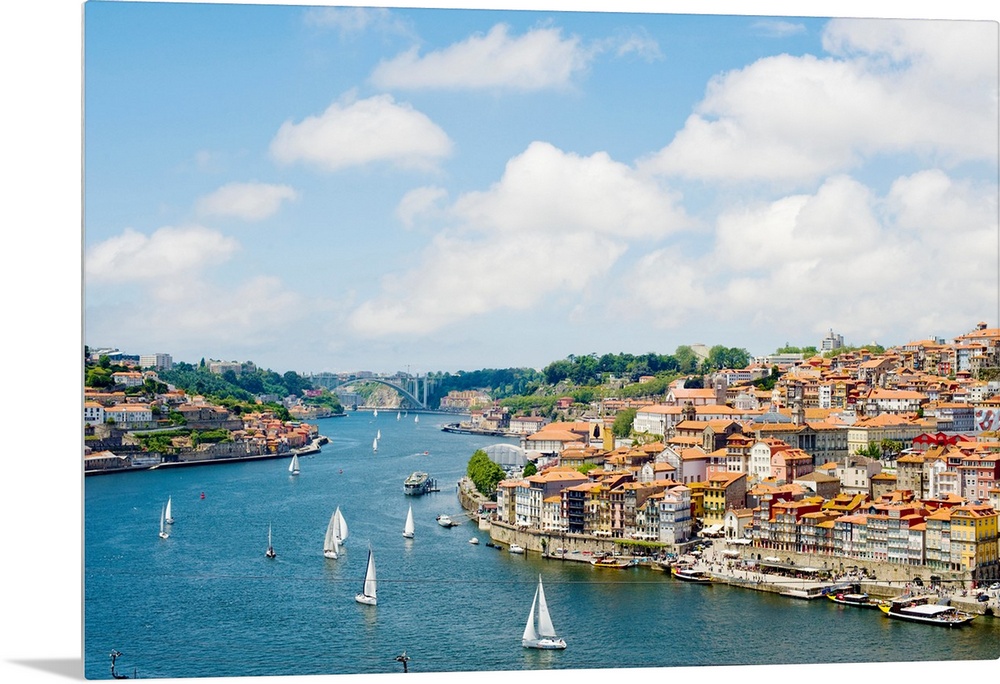 <p>A view of Porto's historic centre and the Duoro River flowing towards its estuary and the Atlantic Ocean, Porto, Norte, Portugal, Europe</p>