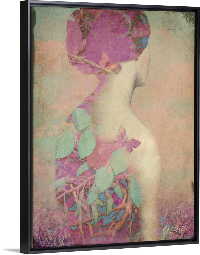 <p>A portrait of a woman looking away with a overlap of floral branches in pastel colors.</p>