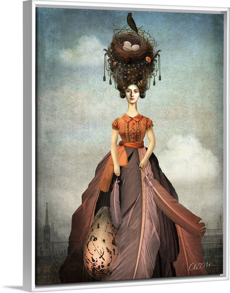 <p>A digital composite of a female wearing a dress made of feathers with a bird nest on her head.</p>