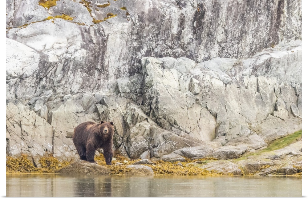 <p>Portrait of a brown bear (Ursus arctos) standing in front of a rocky cliff face along the shore in Glacier Bay National Park Southeast Alaska, Alaska, United States of America</p>