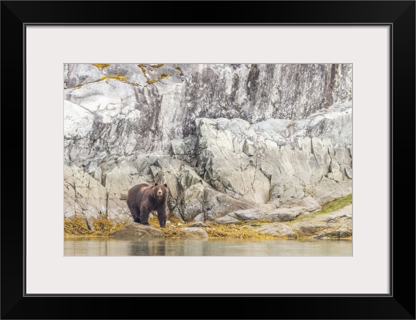 <p>Portrait of a brown bear (Ursus arctos) standing in front of a rocky cliff face along the shore in Glacier Bay National Park Southeast Alaska, Alaska, United States of America</p>