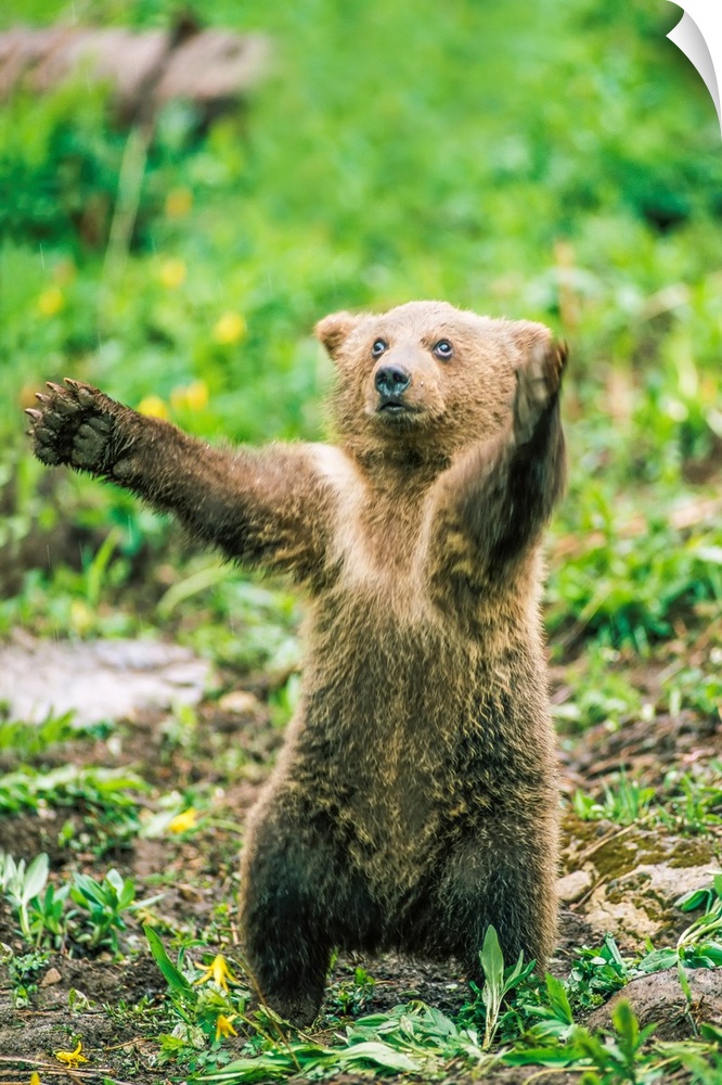 <p>Portrait of a brown bear cub (Ursus arctos) balancing on its hind legs, standing upright with its arms outstretched, Montana, United States of America</p>