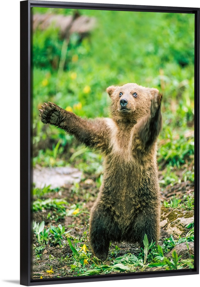 <p>Portrait of a brown bear cub (Ursus arctos) balancing on its hind legs, standing upright with its arms outstretched, Montana, United States of America</p>