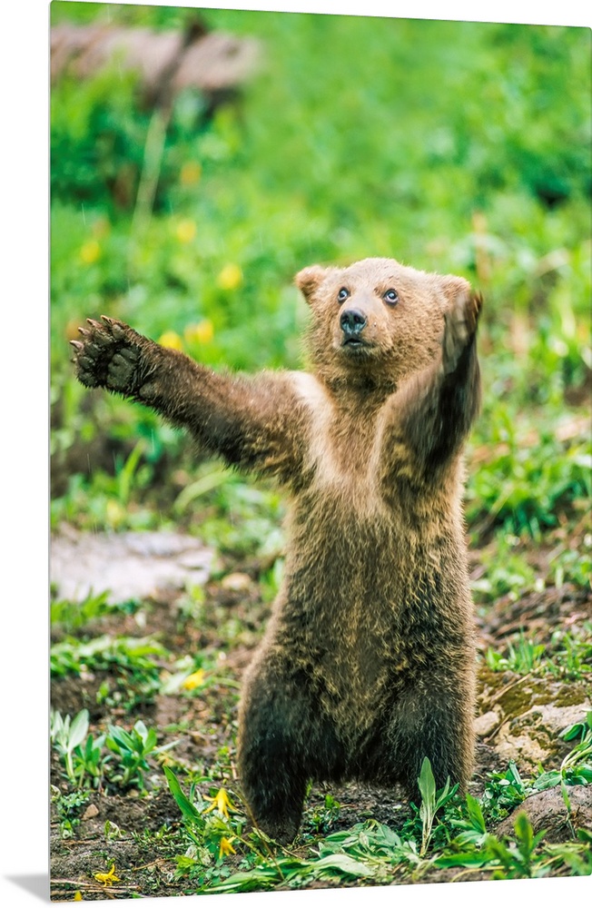 <p>Portrait of a brown bear cub (Ursus arctos) balancing on its hind legs, standing upright with its arms outstretched, Montana, United States of America</p>