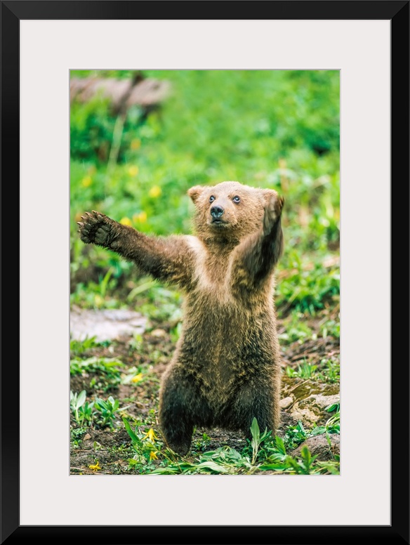 <p>Portrait of a brown bear cub (Ursus arctos) balancing on its hind legs, standing upright with its arms outstretched, Montana, United States of America</p>