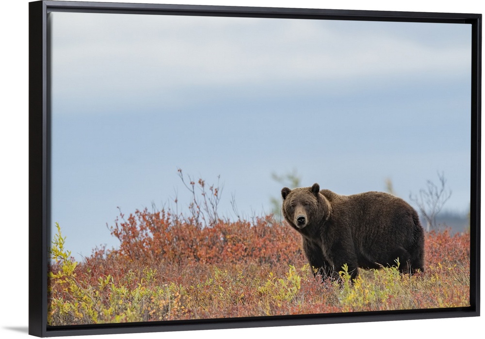 <p>Portrait of a grizzly bear (Ursus arctos horribilis) standing in a field of autumn colored bushes and curiously looking at the camera; Dawson City, Yukon, Canada</p>