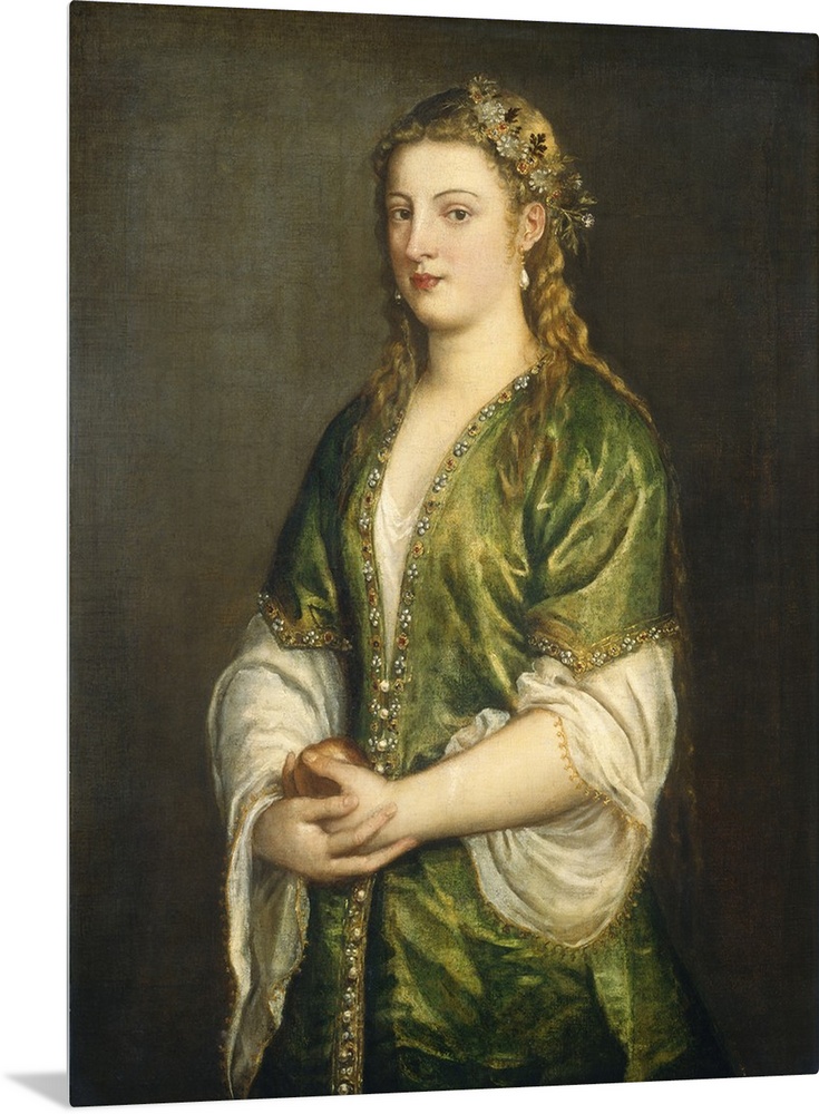 <p>Portrait of a Lady, by Titian, 1555, Italian Venetian painting, oil on canvas. The unnamed young Venetian woman wears a white shift with gold braid edging, under an overdress adorned with pearls and jewels, echoed by a floral garland in her blond hair (BSLOC_2016_6_141)</p>