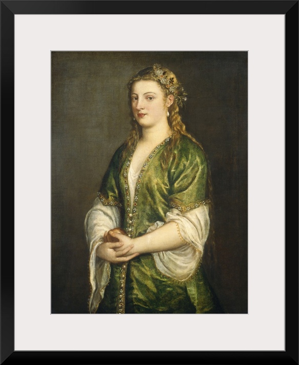 <p>Portrait of a Lady, by Titian, 1555, Italian Venetian painting, oil on canvas. The unnamed young Venetian woman wears a white shift with gold braid edging, under an overdress adorned with pearls and jewels, echoed by a floral garland in her blond hair (BSLOC_2016_6_141)</p>