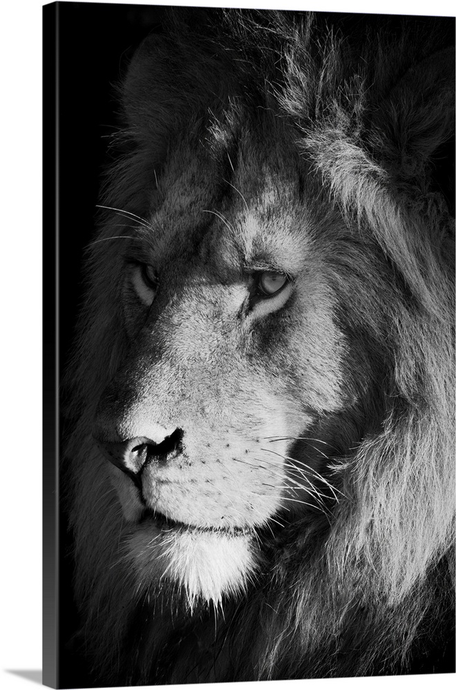 <p>Close-up of a lion (panthera leo), head shot portrait of a male animal looking out into the savanna at sunrise, Serengeti, Tanzania.</p>