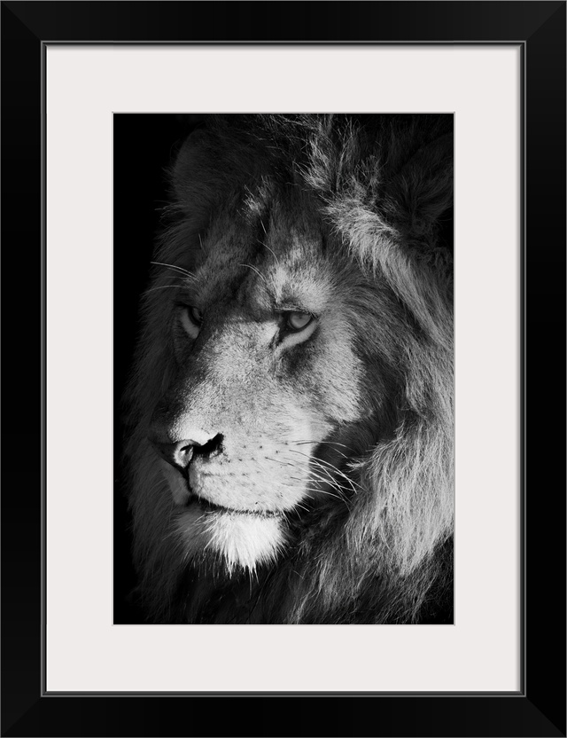 <p>Close-up of a lion (panthera leo), head shot portrait of a male animal looking out into the savanna at sunrise, Serengeti, Tanzania.</p>