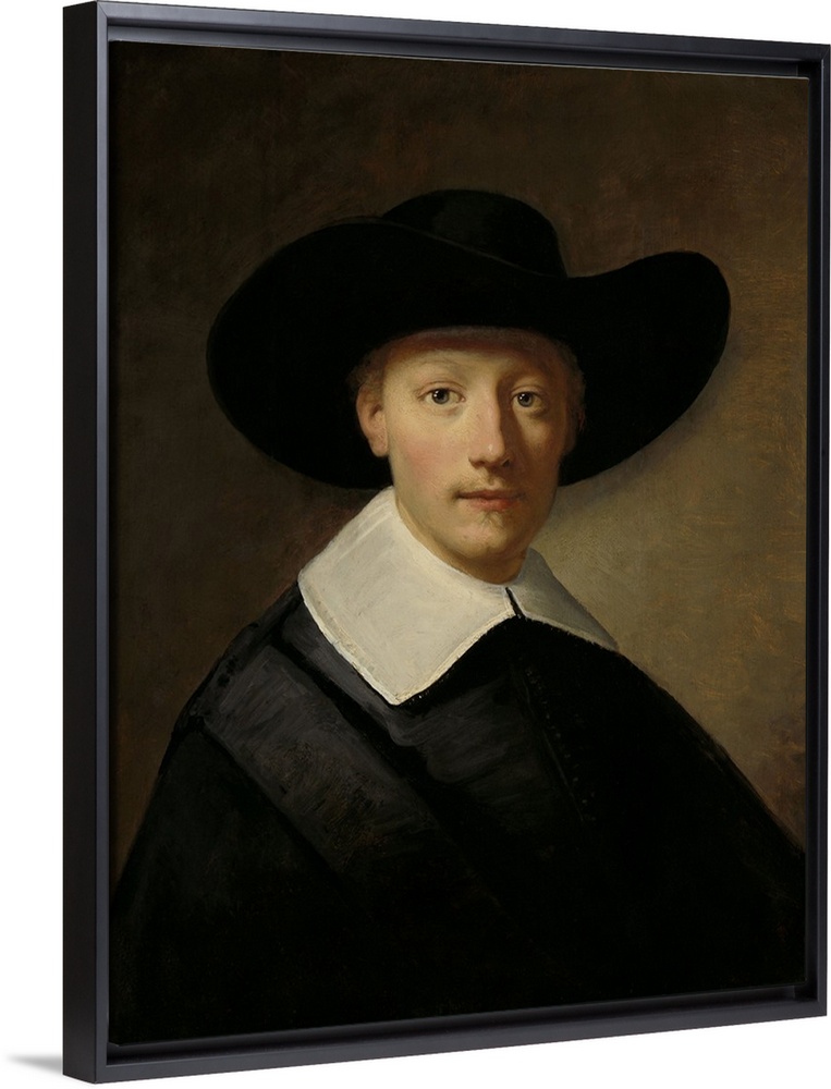 <p>Portrait of a Man, known as Gozen Centen, by Govert Flinck, c. 1639 -40, oil on panel. Gozen Centen lived from 1411 to 1677. He wears a wide brim hat and simple flat linen collar.</p>