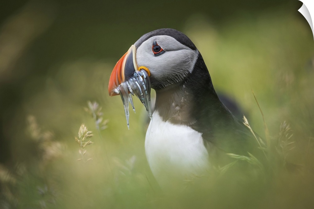 <p>Portrait of a puffin carrying several sand eels. Mykines, Faroe Islands</p>