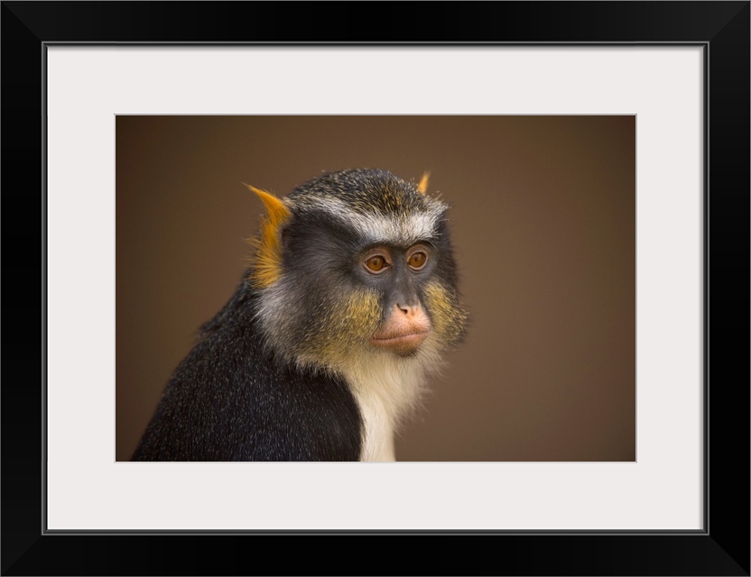 <p>Close-up portrait of a Sykes' monkey (cercopithecus albogularis) against a brown background, Colorado Springs, Colorado, united states of America.</p>