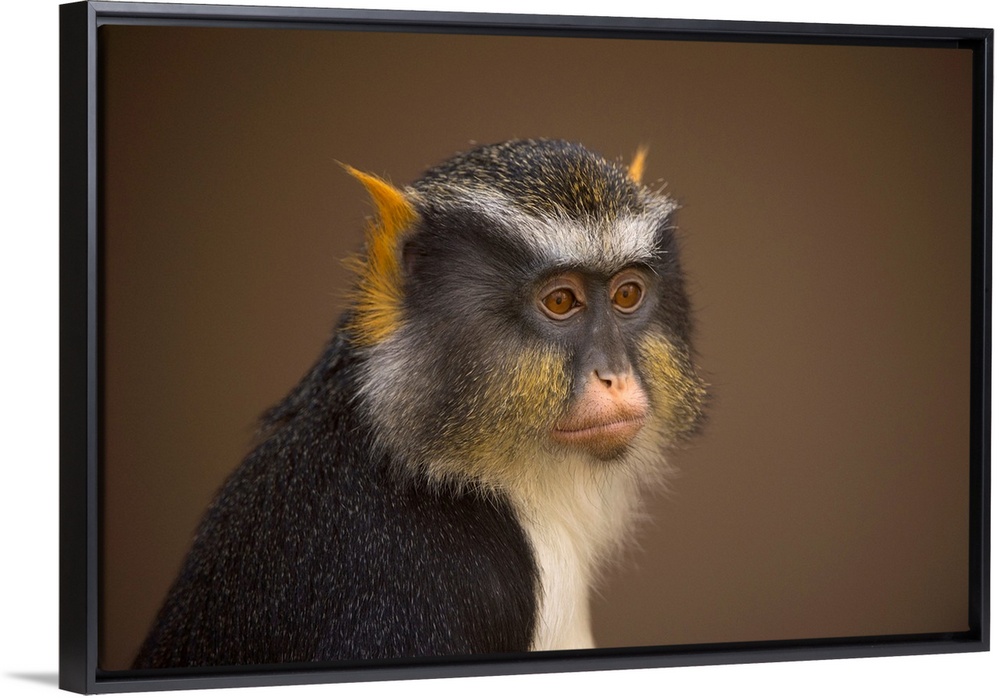 <p>Close-up portrait of a Sykes' monkey (cercopithecus albogularis) against a brown background, Colorado Springs, Colorado, united states of America.</p>