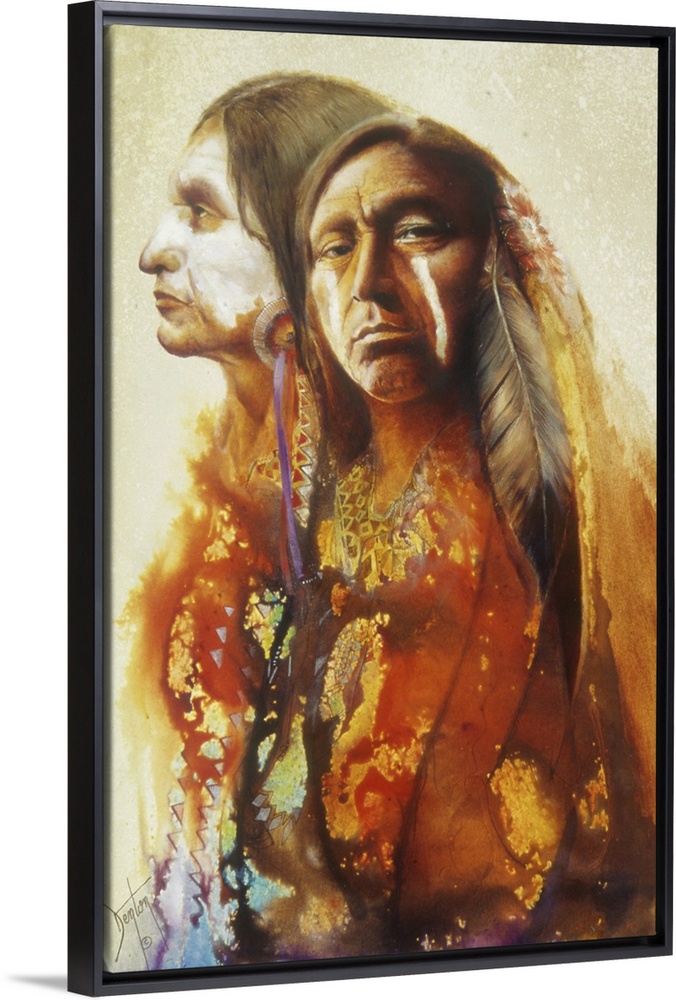 <p>A contemporary painting of two Native American men seen with vibrant dripping colors streaming down from them.</p>