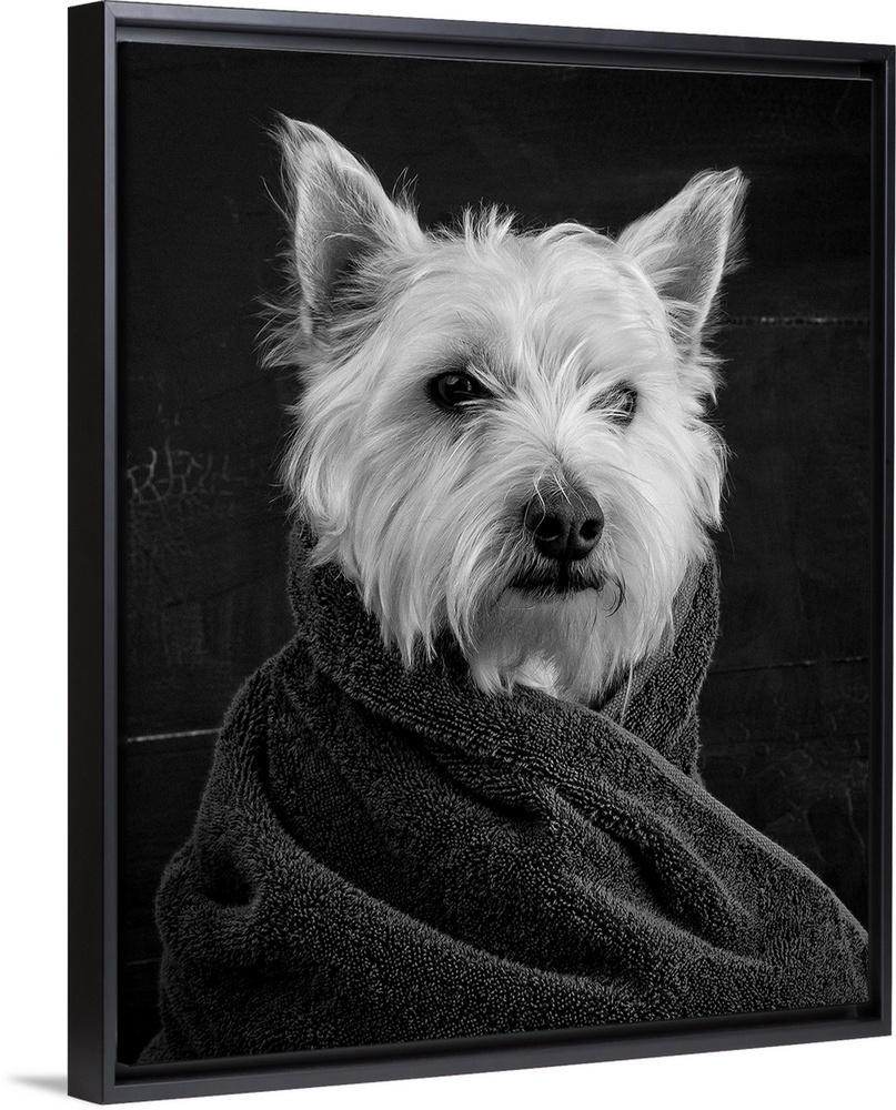 <p>Black and white portrait of a westie dog wrapped in a towel.</p>