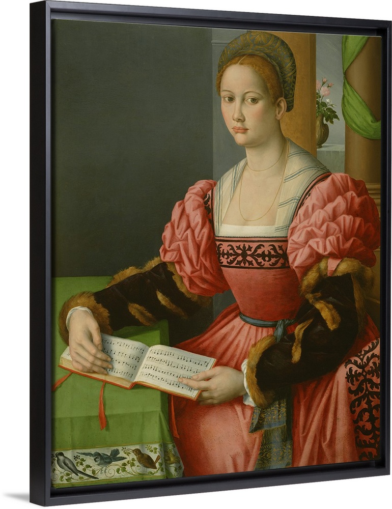 <p>Portrait of a Woman with a Book of Music, by Bacchiacca, 1540, Italian Renaissance painting, oil on canvas. Young woman in an elegant, dress with embroidered panels and fur lined sleeves. She may have been a been a member of the Frescobaldi, a powerful Fl</p>