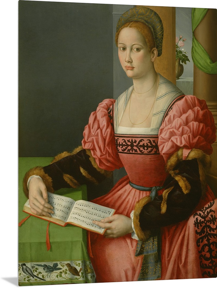 <p>Portrait of a Woman with a Book of Music, by Bacchiacca, 1540, Italian Renaissance painting, oil on canvas. Young woman in an elegant, dress with embroidered panels and fur lined sleeves. She may have been a been a member of the Frescobaldi, a powerful Fl</p>