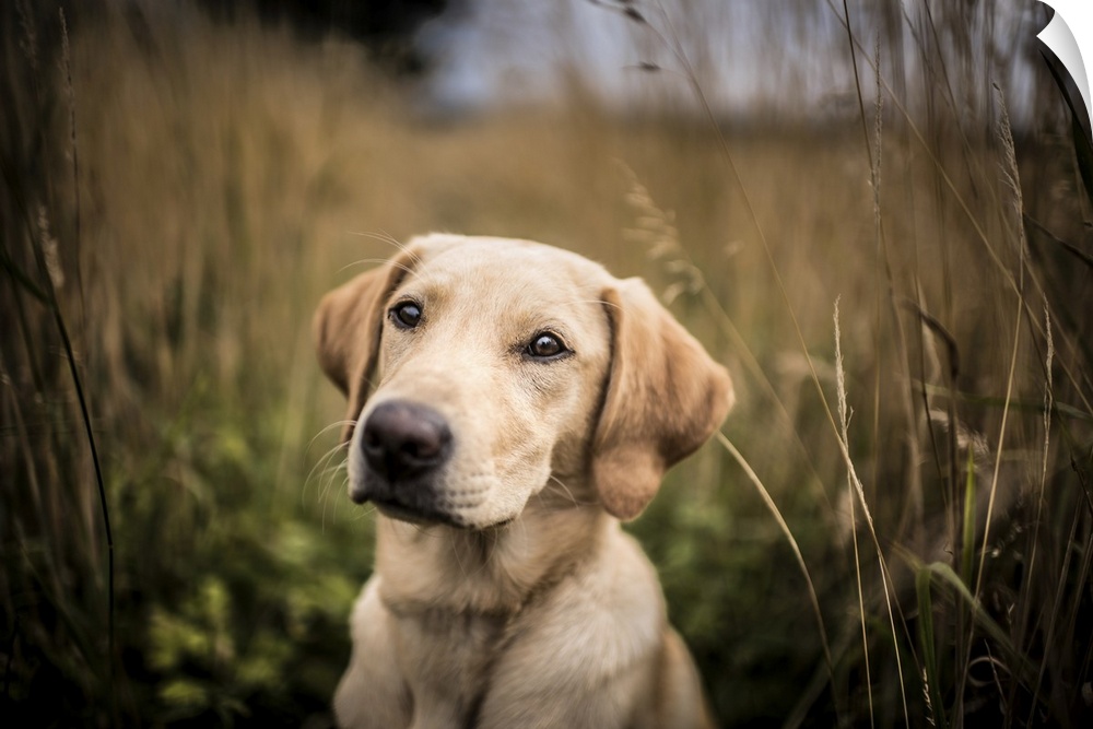 <p>Portrait of a young Golden Labrador sitting in a field, United Kingdom, Europe</p>