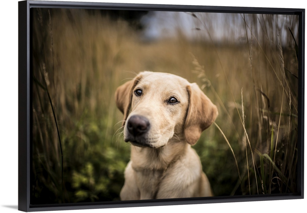 <p>Portrait of a young Golden Labrador sitting in a field, United Kingdom, Europe</p>