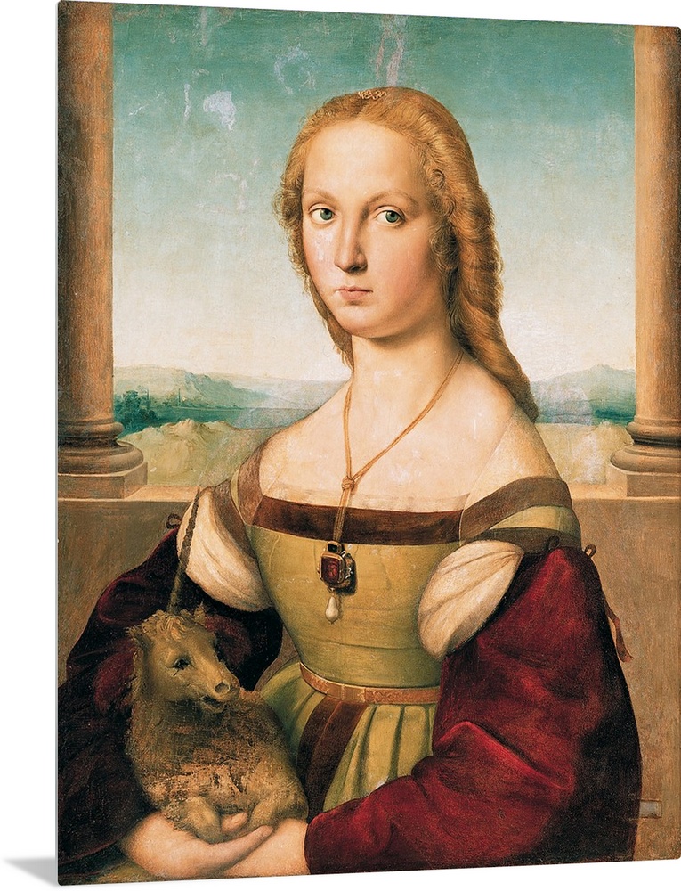 <p>Portrait of a Young Woman (Lady with a Unicorn), by Raffaello Sanzio, 1505 - 1506, 16th Century, oil on panel transferred to canvas, cm 67,7 x 53,2 - Italy, Lazio, Rome, Borghese Gallery. All. female portrait diadem fantastic animal unicorn necklace blond</p>