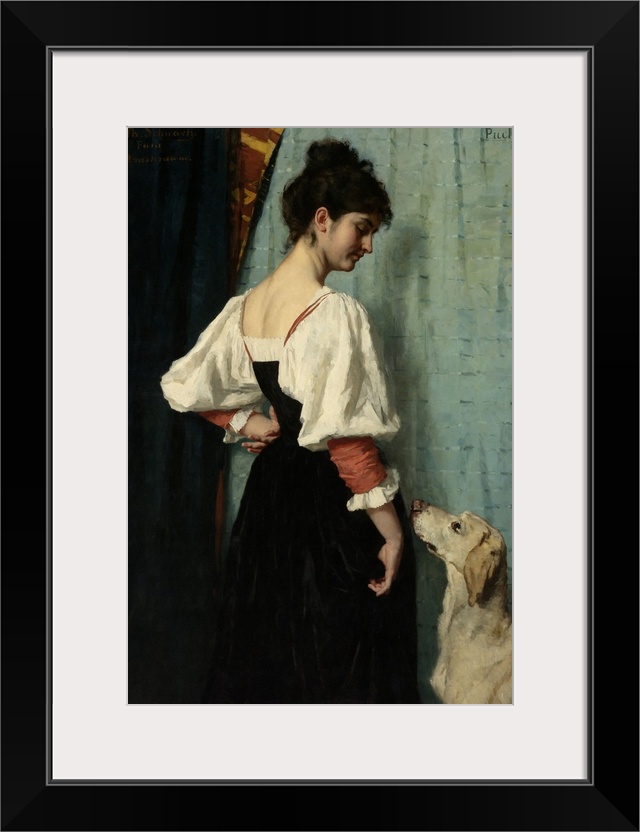 <p>Portrait of a Young Woman, with 'Puck' the Dog, by Therese Schwartze, c. 1879-85, Dutch painting, oil on canvas. The model wears an Italian costume of rich fabrics in the artist's Paris studio.</p>