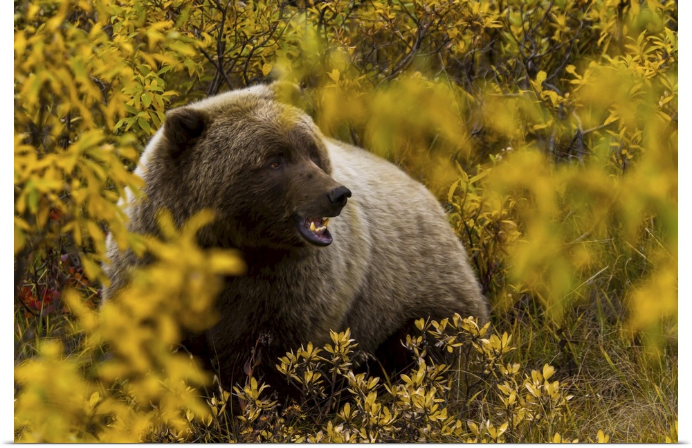 <p>Portrait of an Alaskan brown bear amid fall foliage.</p>