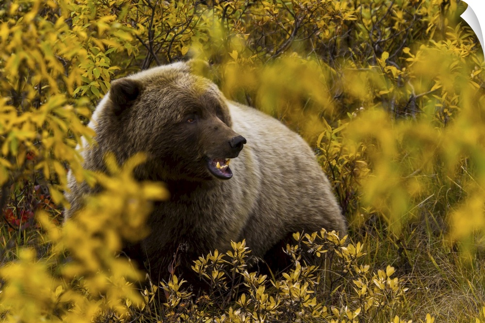 <p>Portrait of an Alaskan brown bear amid fall foliage.</p>