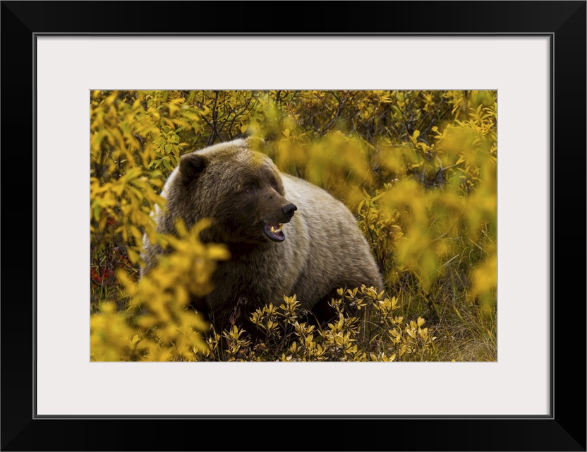 <p>Portrait of an Alaskan brown bear amid fall foliage.</p>