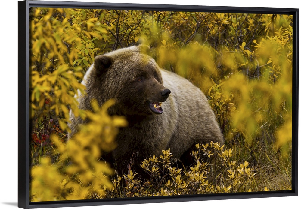 <p>Portrait of an Alaskan brown bear amid fall foliage.</p>
