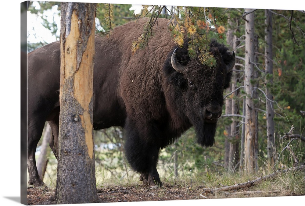 <p>Portrait of an American bison, Bison bison, among pine trees.</p>