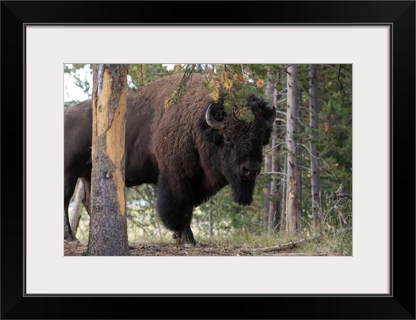 <p>Portrait of an American bison, Bison bison, among pine trees.</p>