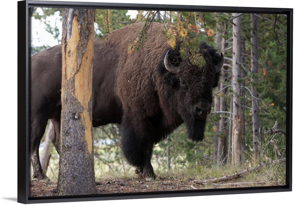 <p>Portrait of an American bison, Bison bison, among pine trees.</p>