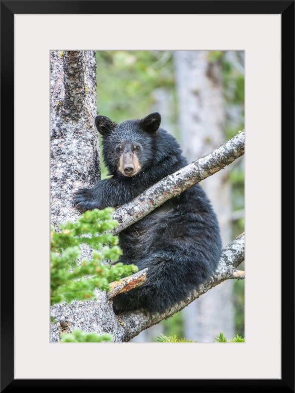 <p>Portrait of an American black bear cub (Ursus americanus) looking at camera and climbing a tree in Yellowstone National Park. The American black bear is one of eight species of bear in the world and one of three on the North American continent, Wyoming, United States of America</p>