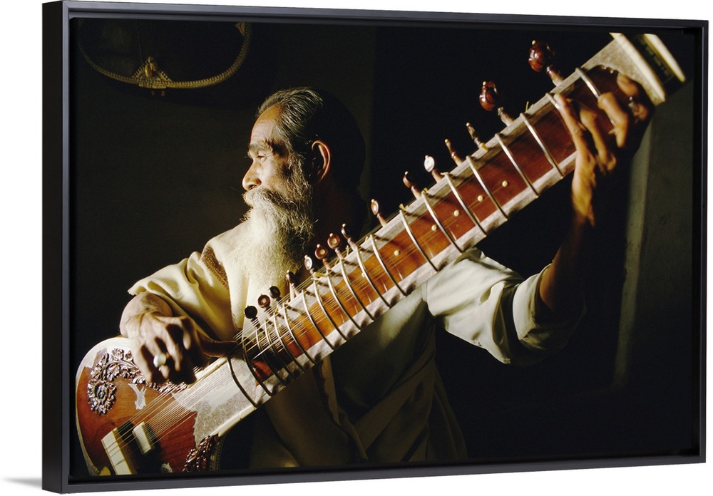 <p>Portrait of an elderly man playing the sitar, India</p>