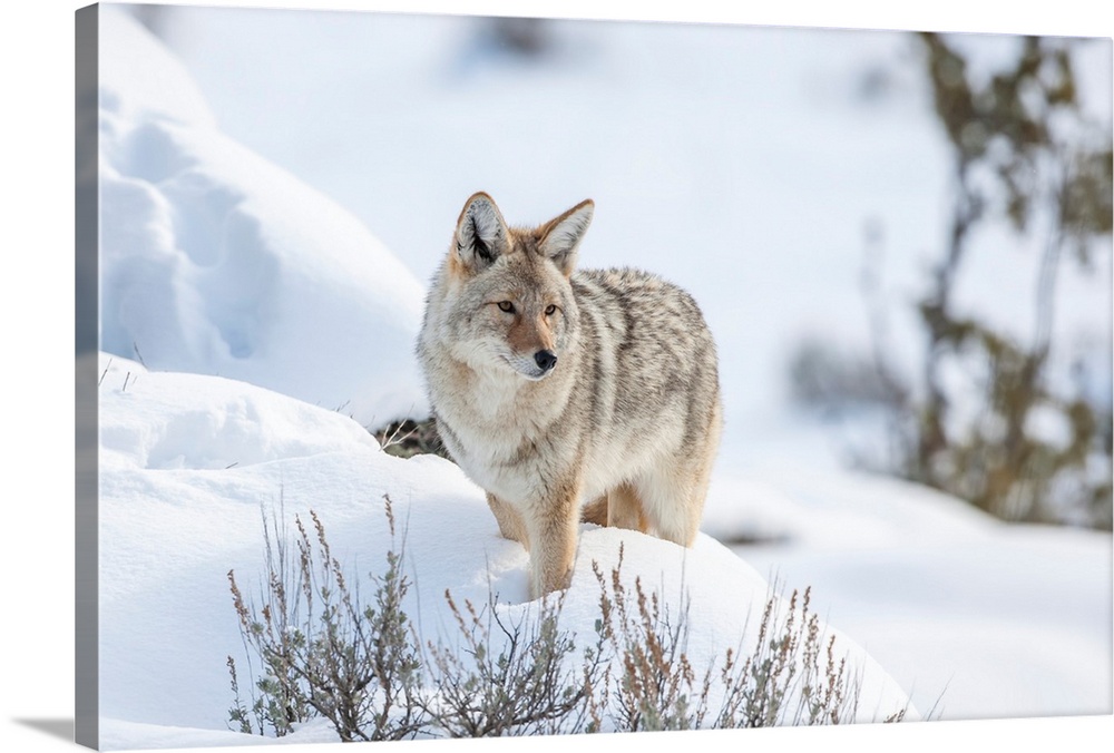 <p>Portrait of coyote (Canis latrans) standing in a snowbank keeping watch over the wintry landscape, Montana, United States of America</p>