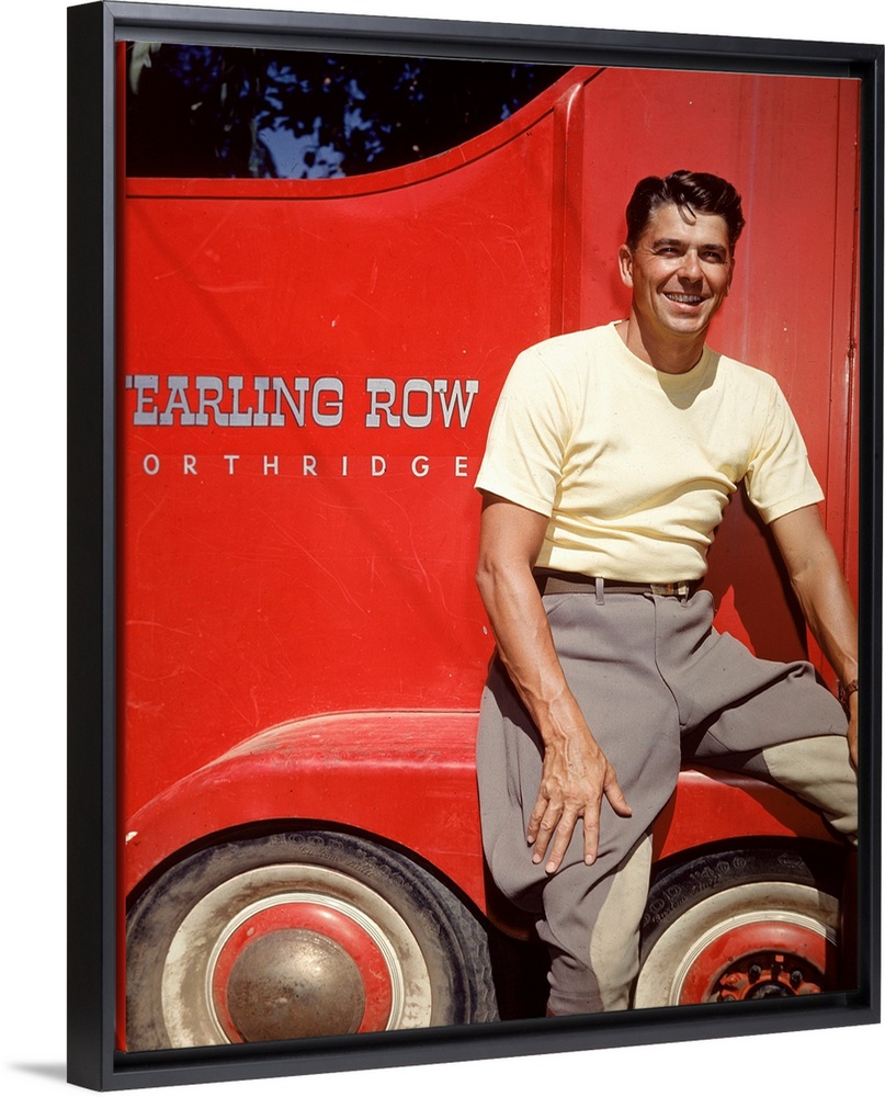 <p>American actor and politician Ronald Reagan poses in front of a red trailer belonging to the Yearling Row ranch, Northridge, California, circa 1960 Reagan wears a yellow t-shirt, grey jodhpurs, and riding boots (Hulton ArchiveGetty Images)</p>