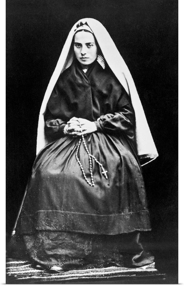 <p>Seated portrait of St. Bernadette of Lourdes in her habit holding a rosary.</p>